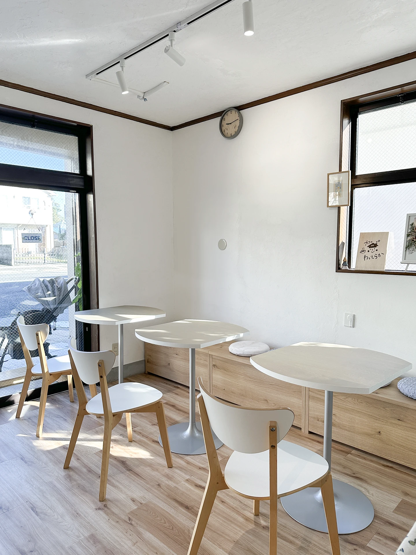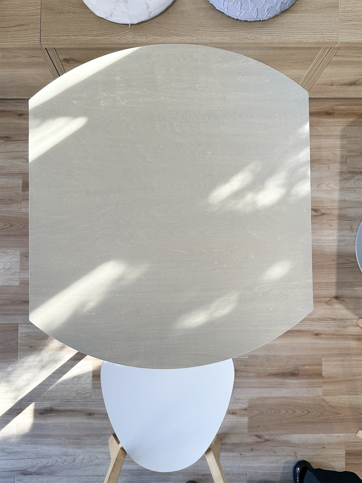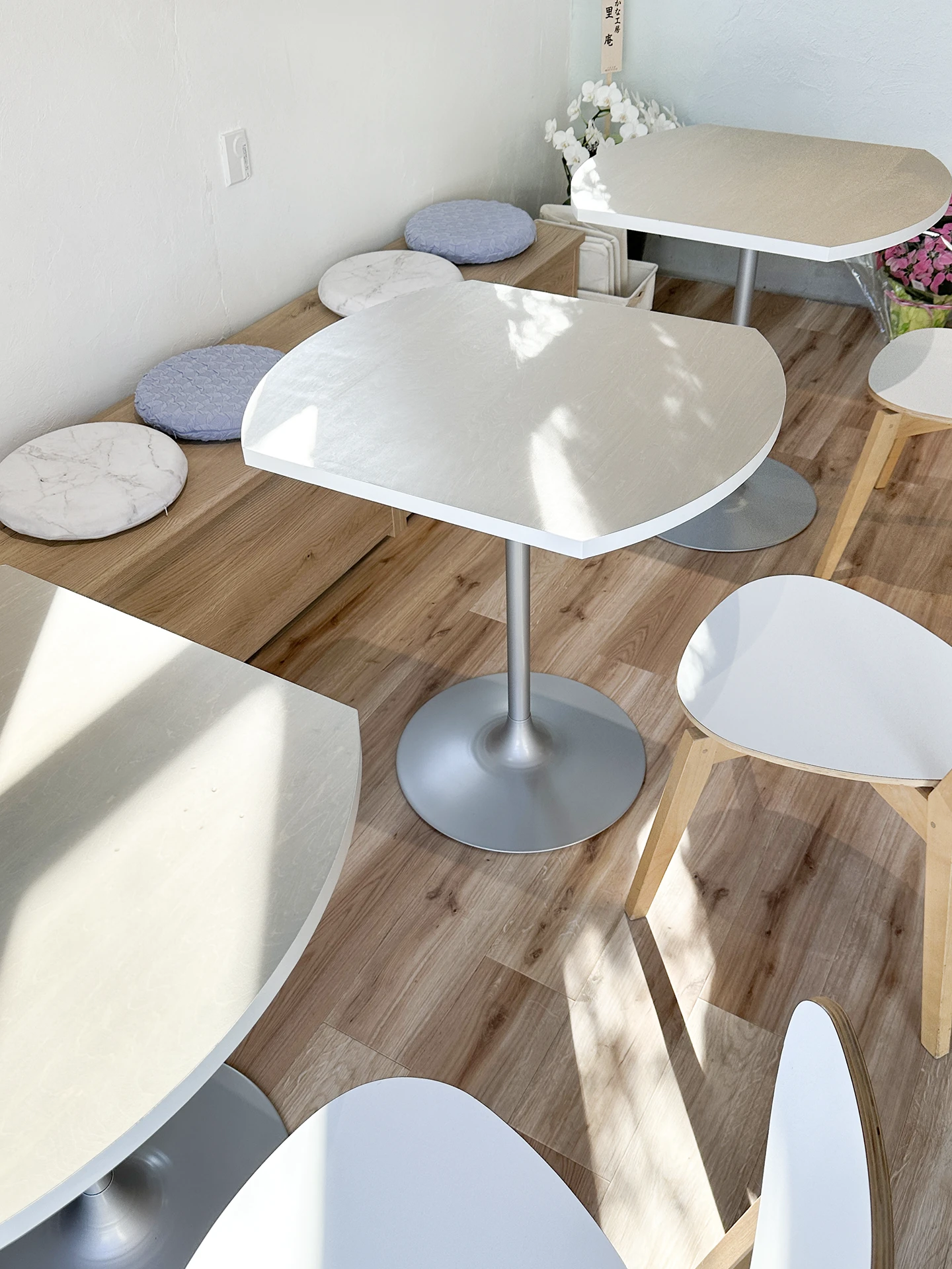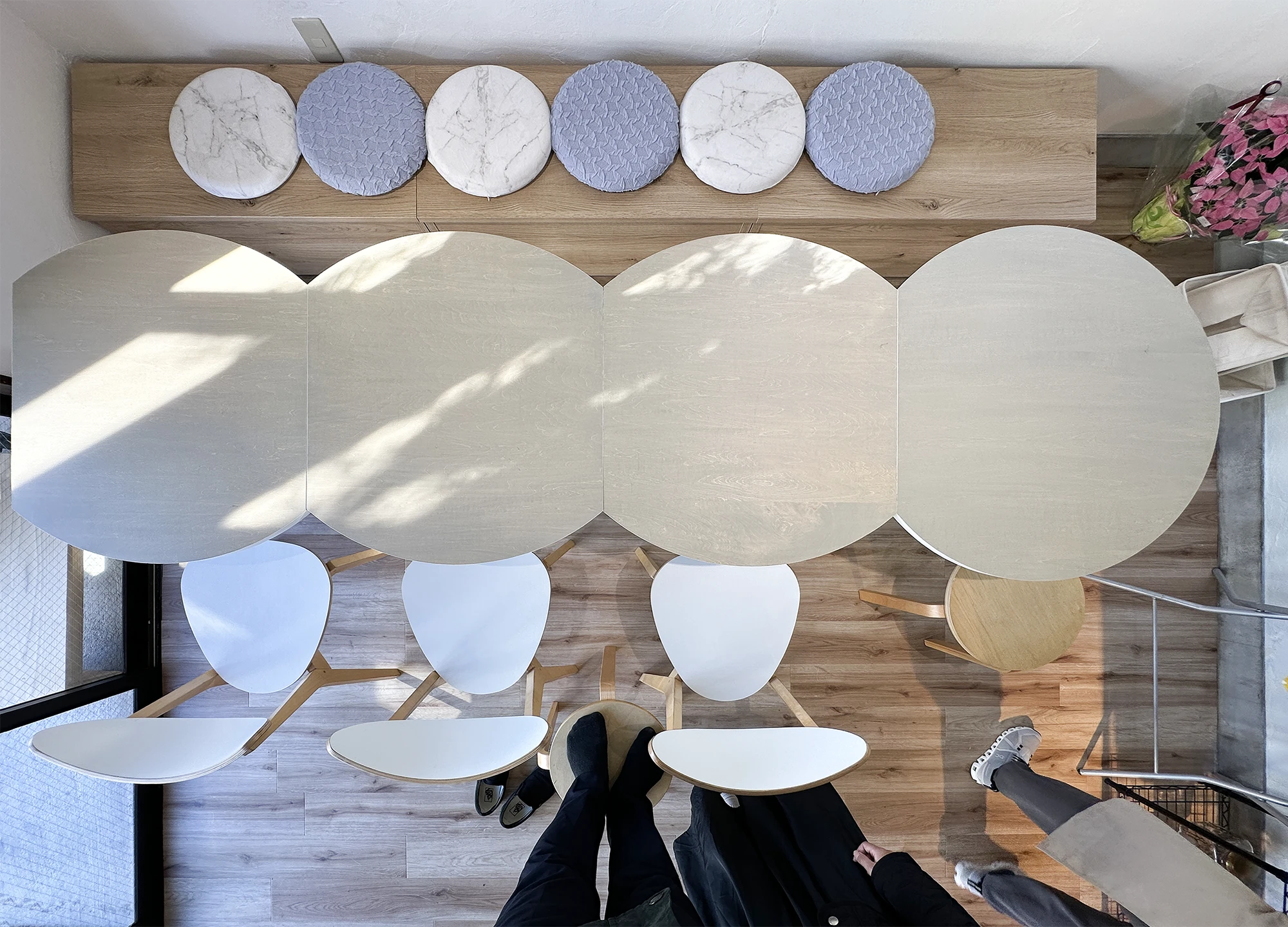 カフェの名前から『輪』の形(円卓)をベースに、その輪が複数集まることで大きなテーブルにもなる、左右対称の位置を切り落とした形状のテーブルとしました。