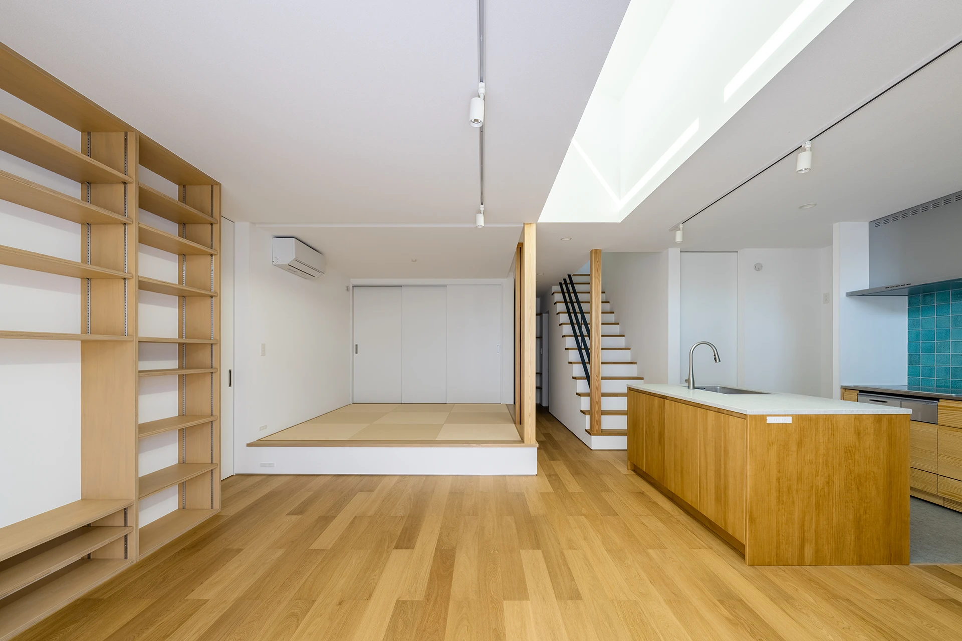 リビング・ダイニング・キッチンに小上がりを加えた生活空間はそれぞれを田の字型に配置したワンルームです。