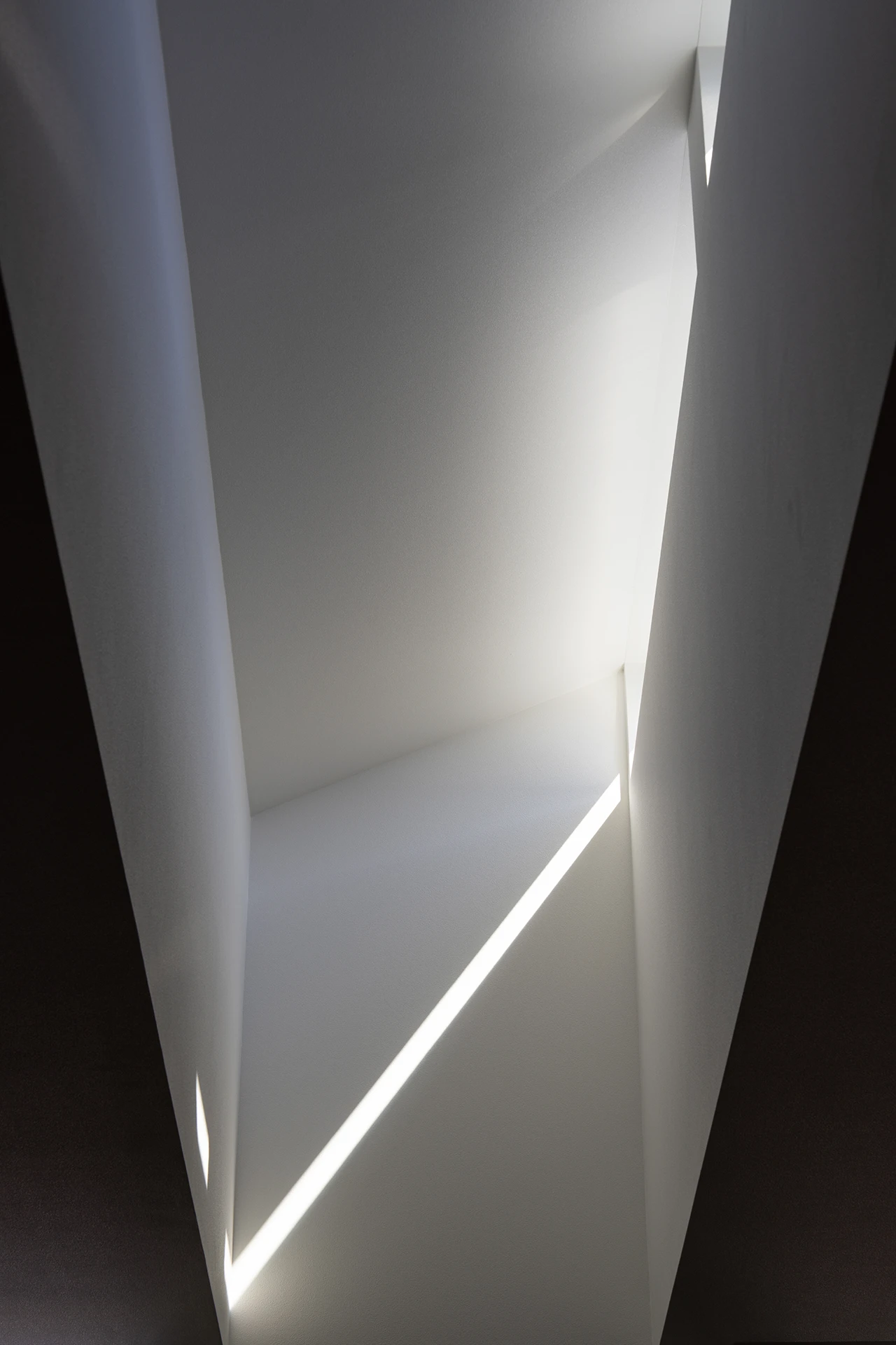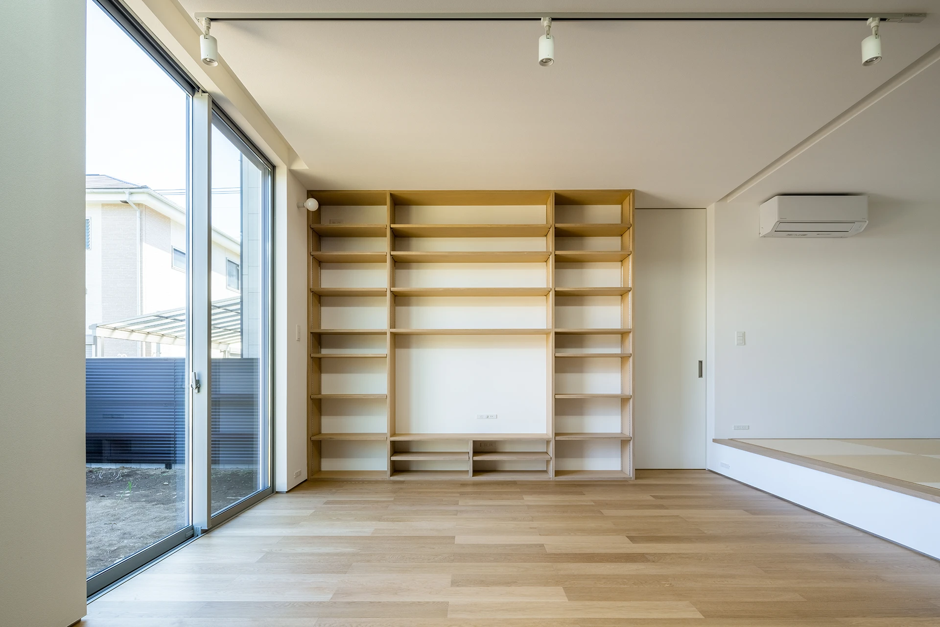 この生活空間は、大きな開口部を庭に出るための掃出し窓一枚に抑え、主にハイサイドライトにから室内の採光を確保し、プライバシーに配慮しています。
