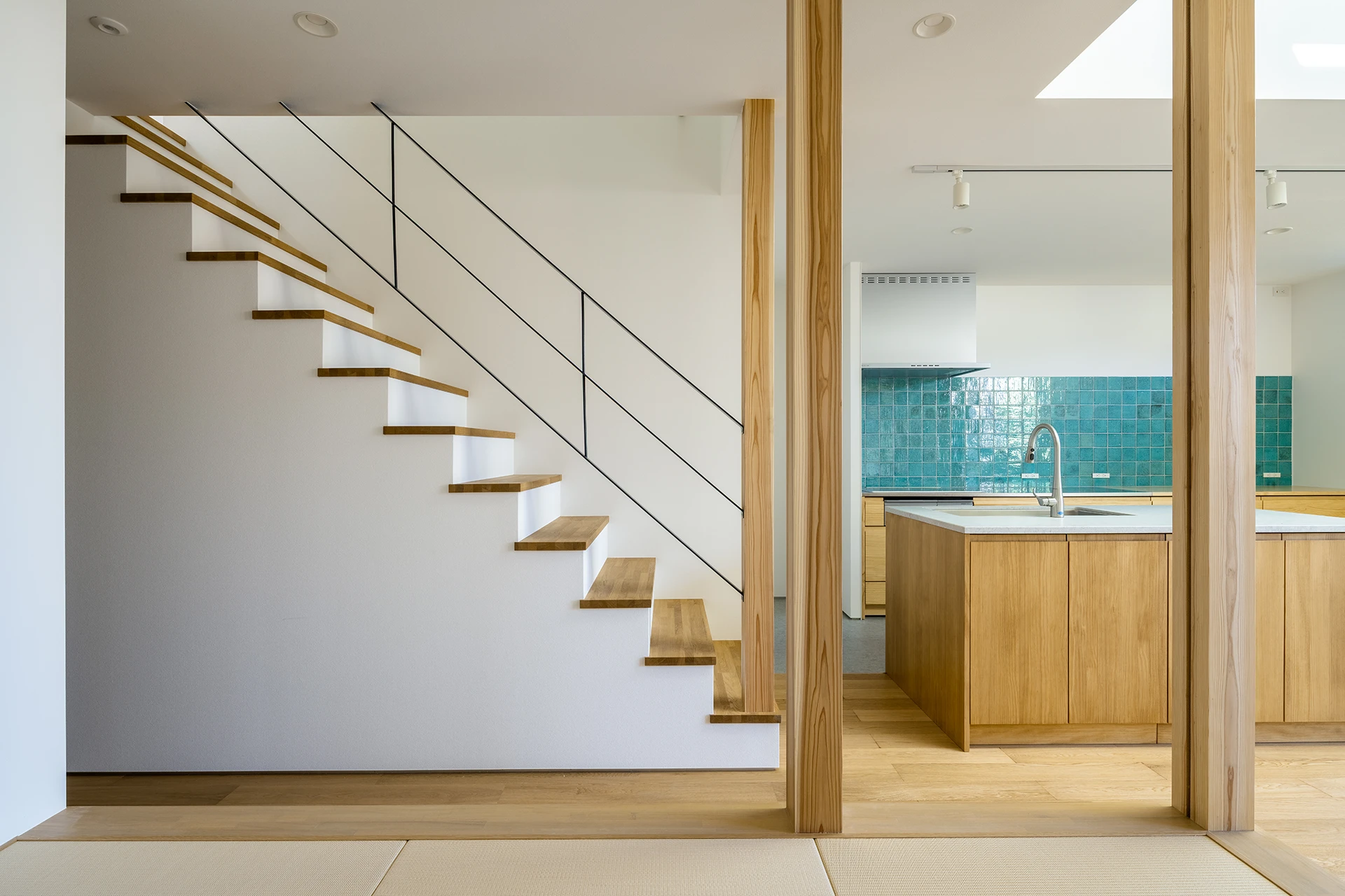 住まいは2階建ての構成で、1階は家族みんなのスペース、2階は夫婦の寝室や子ども部屋などの個室を配置しています。