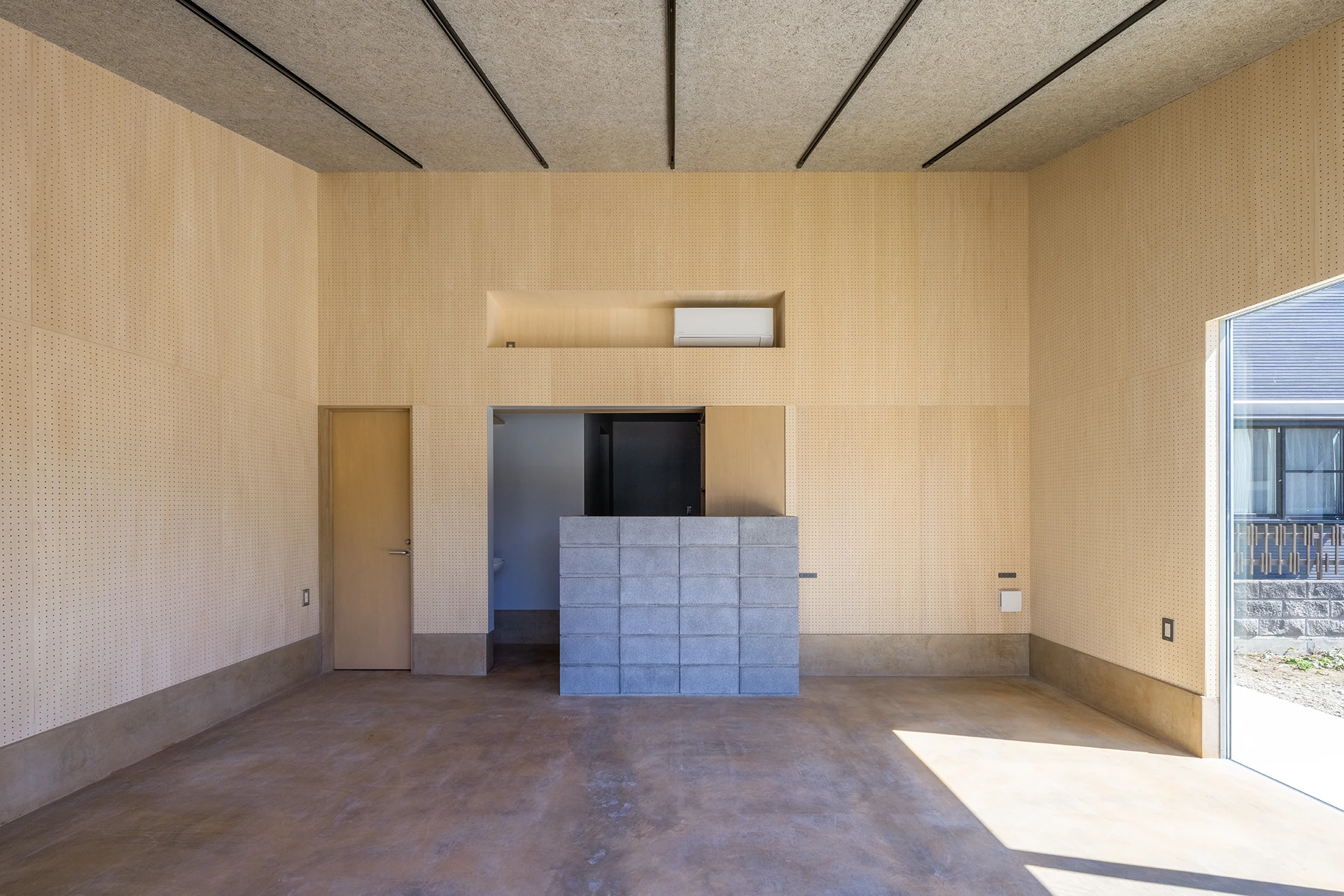 内部空間は壁を有孔合板、天井を木毛セメント板で構成し、木質空間としつつ、吸音に配慮しています。