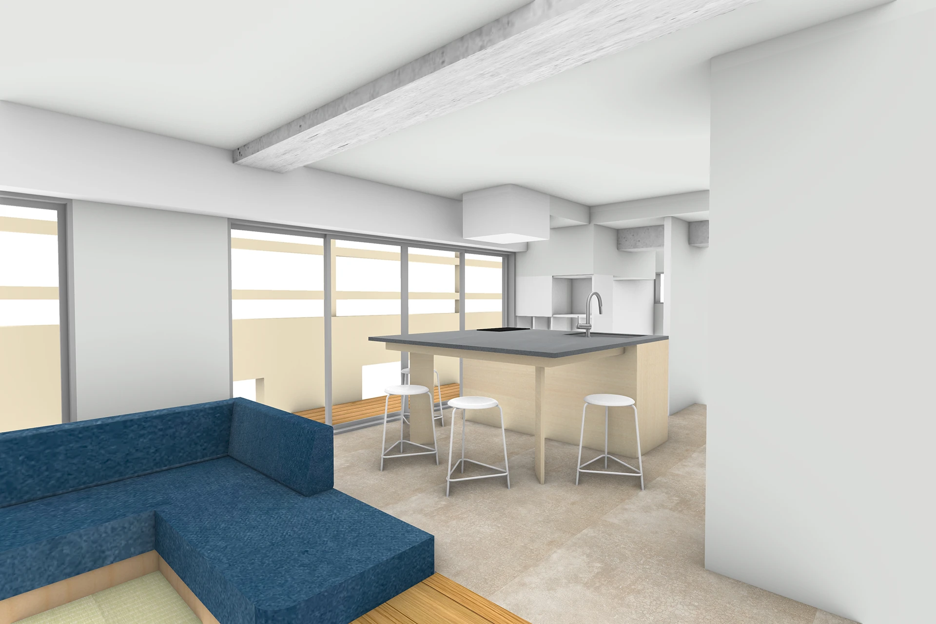 キッチンの場所は変更し、生活空間とつながり、正面には窓越しの緑がのぞめるような構成とします。